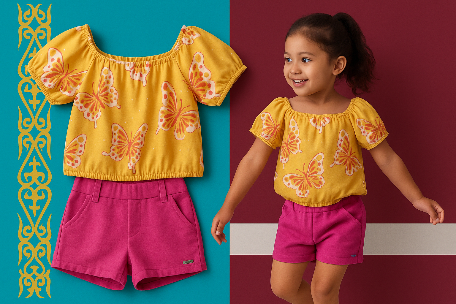 Um conjunto fresquinho, delicado e com cores vibrantes que deixam a criança ainda mais estilosa.