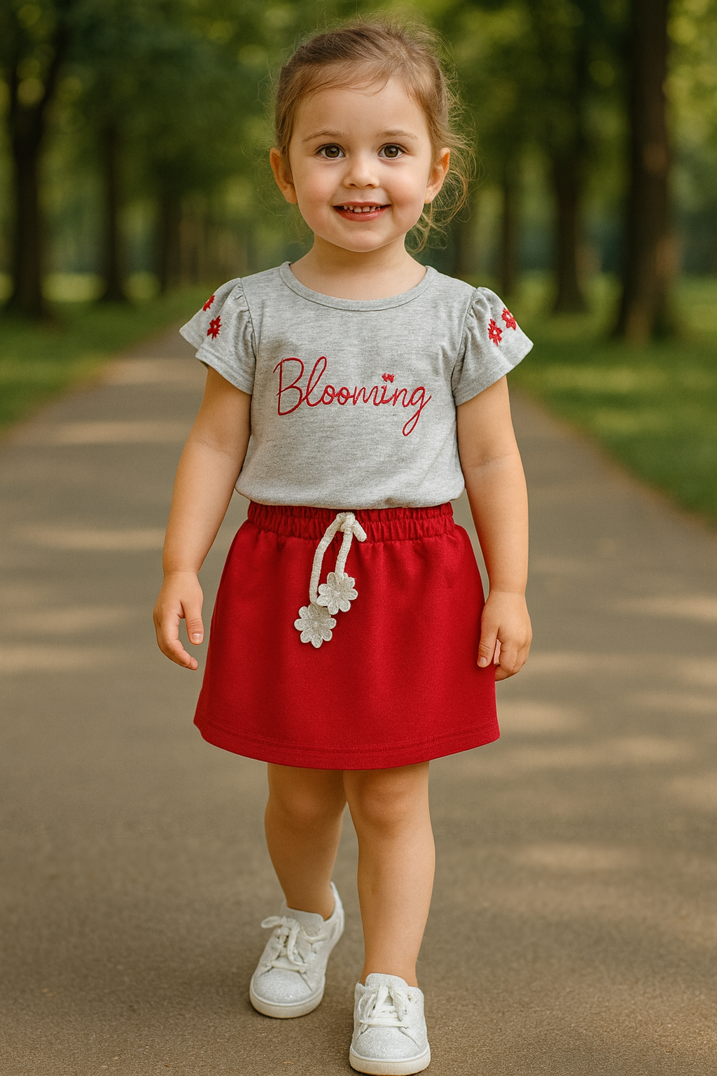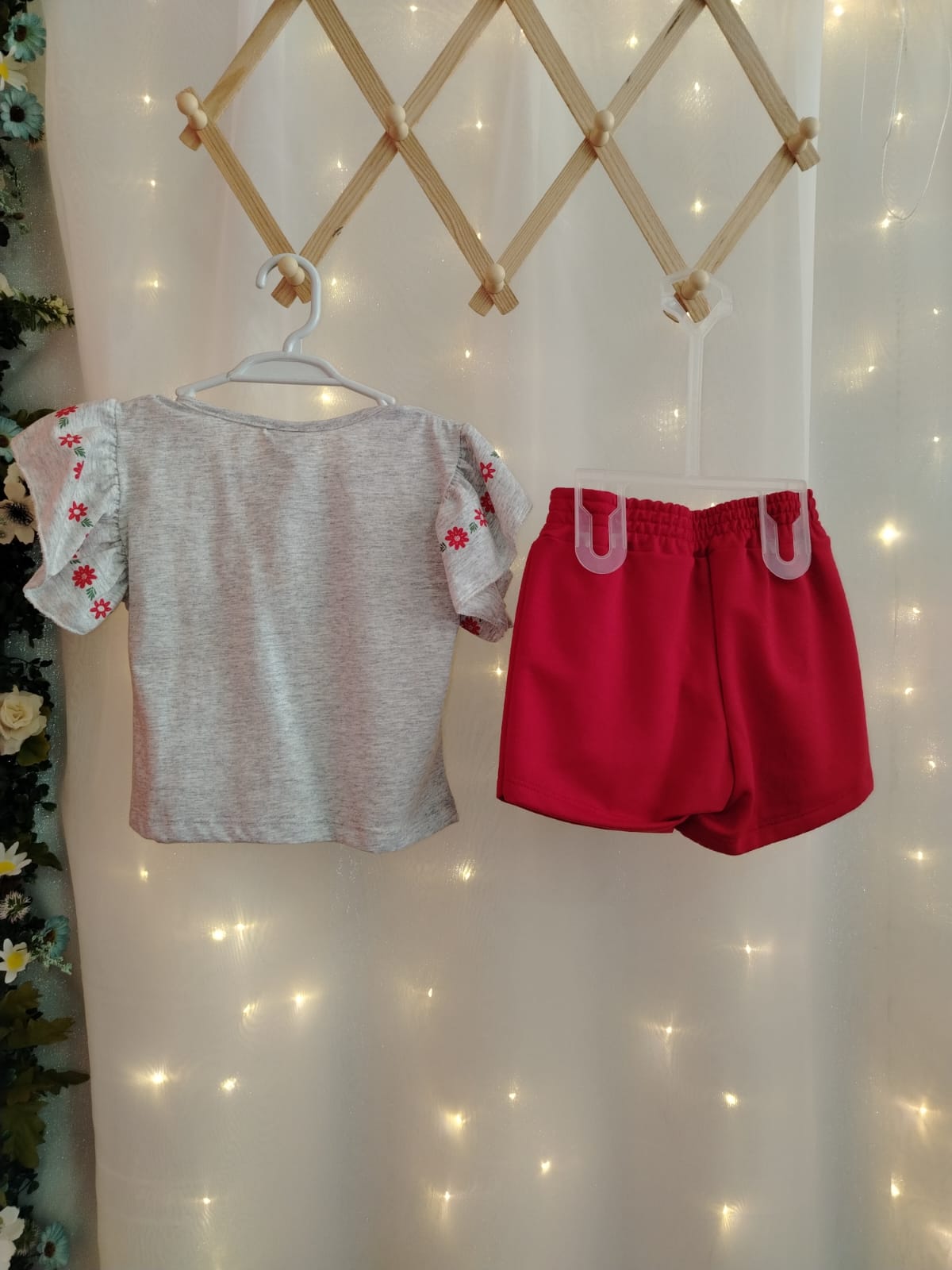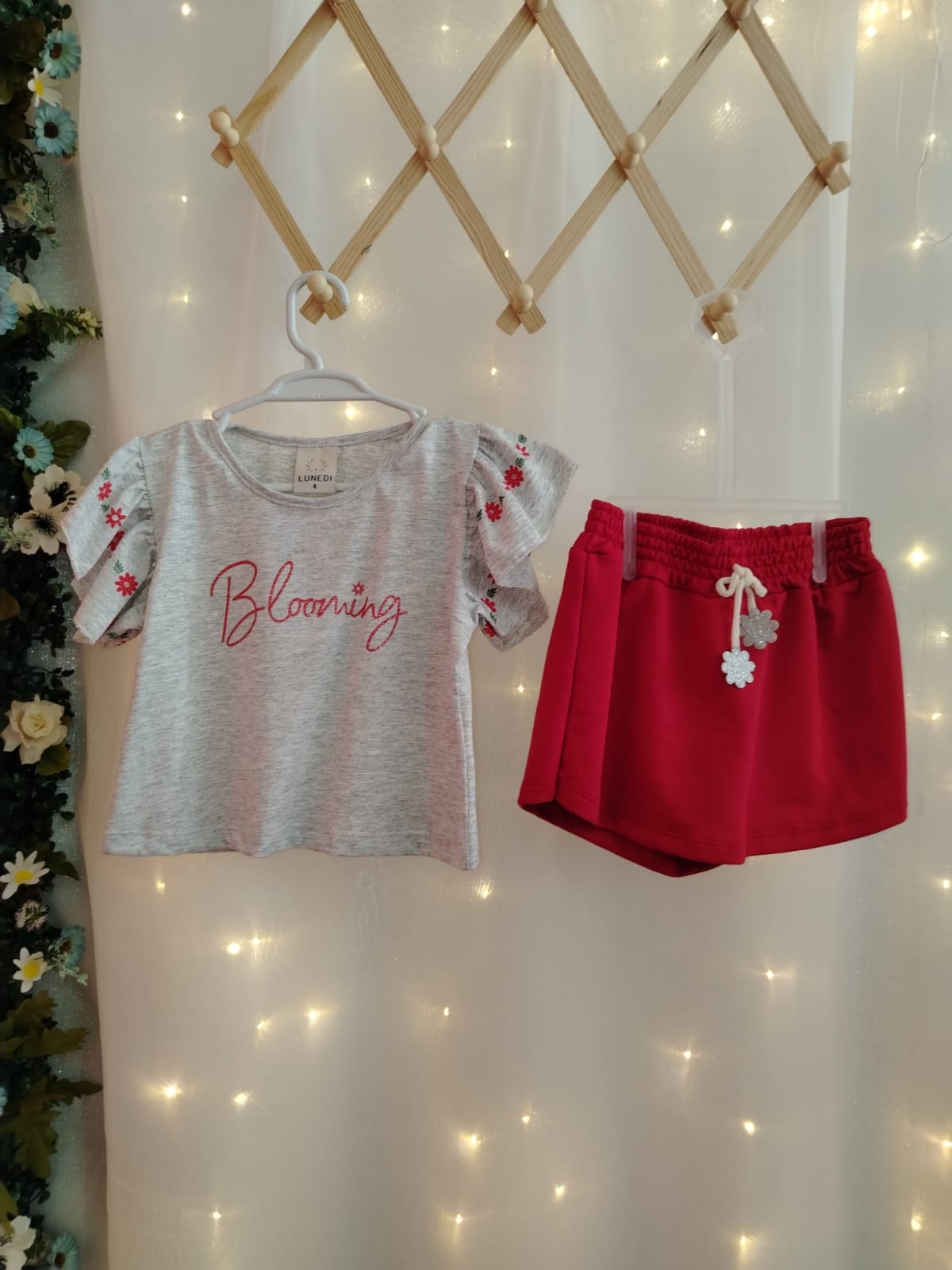 Conjunto infantil feminino da marca Lunedi, composto por blusa cinza com estampa “Blooming” em brilho delicado e mangas curtas com babadinhos e flores bordadas, acompanhado de shorts vermelho com elástico confortável e cordão decorativo com flores lilás.