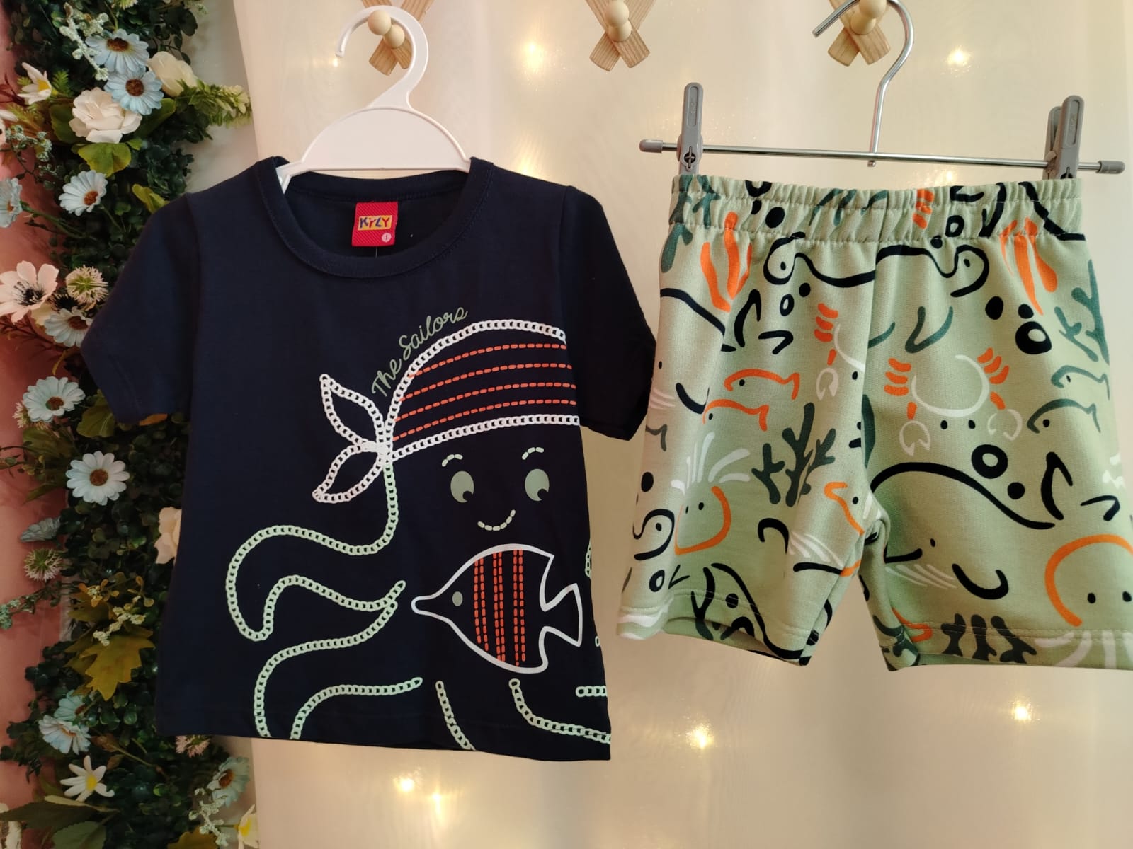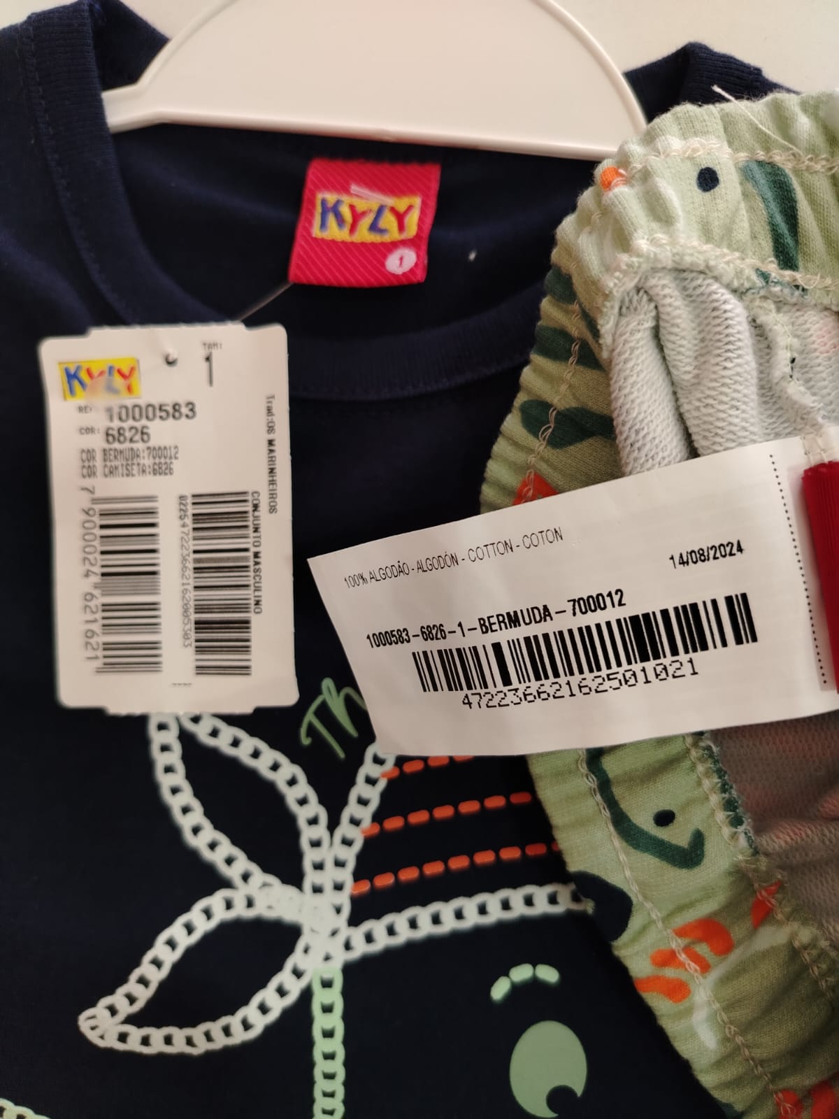 Conjunto infantil masculino composto por camiseta e bermuda, confeccionado em malha 100% algodão, garantindo conforto, maciez e respirabilidade para o dia a dia. A camiseta possui modelagem tradicional, mangas curtas e estampa divertida com tema marítimo, trazendo peixinho e elementos náuticos em cores contrastantes sobre fundo azul-marinho. A bermuda conta com cós elástico, estampa moderna em tons de verde, preto e laranja, proporcionando ótimo ajuste e liberdade de movimentos. Ideal para passeios, brincadeiras e uso diário, unindo conforto, estilo e qualidade Kyly.
