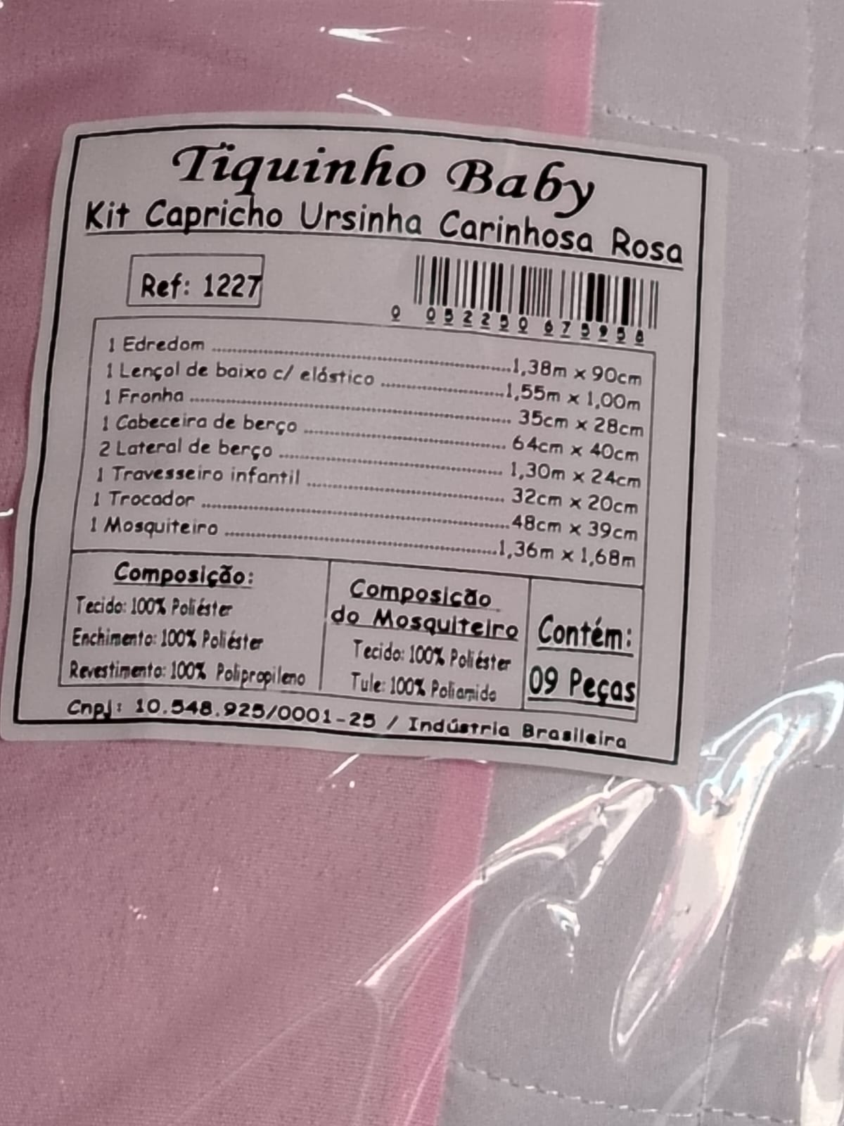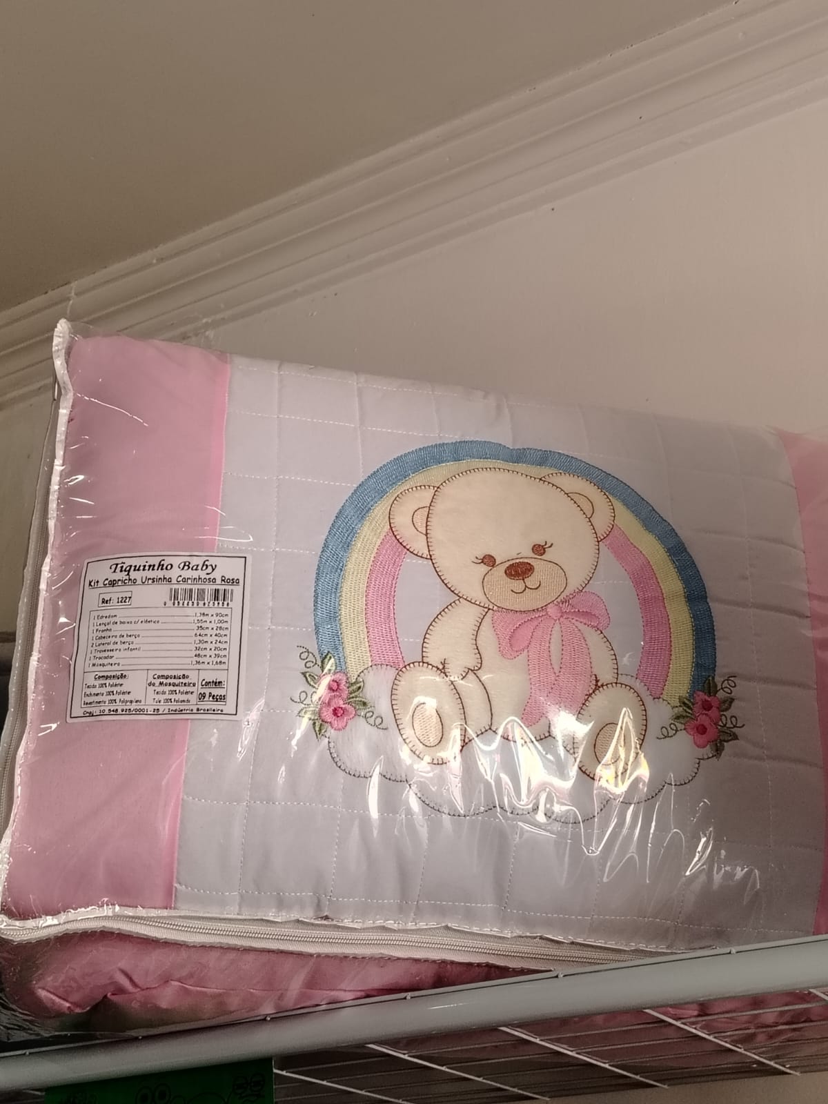 O Kit Berço 9 Peças Ursinha Carinhosa Rosa da marca Tiquinho Baby é puro encanto! Ideal para deixar o berço da sua bebê aconchegante e com um toque delicado. O conjunto é confeccionado em tecido macio e resistente, com enchimento 100% poliéster e acabamento caprichado, destacando o bordado da ursinha com laço rosa e arco-íris colorido.Contém todos os itens essenciais para o conforto do bebê: 1 Edredom (1,38 m x 90 cm) 1 Lençol de baixo com elástico (1,55 m x 1,00 m) 1 Fronha (35 cm x 28 cm) 1 Cabeceira de berço (64 cm x 40 cm) 2…