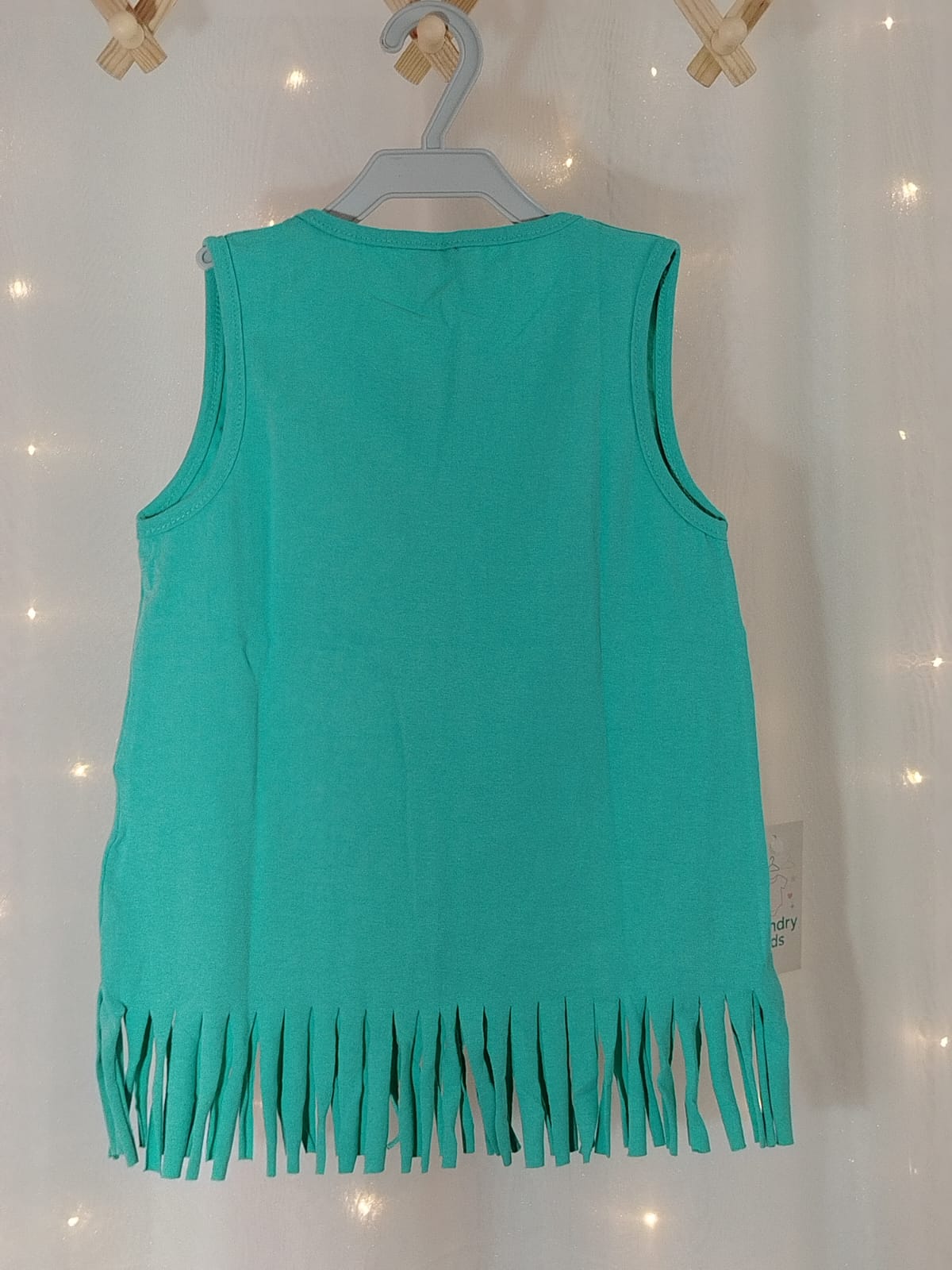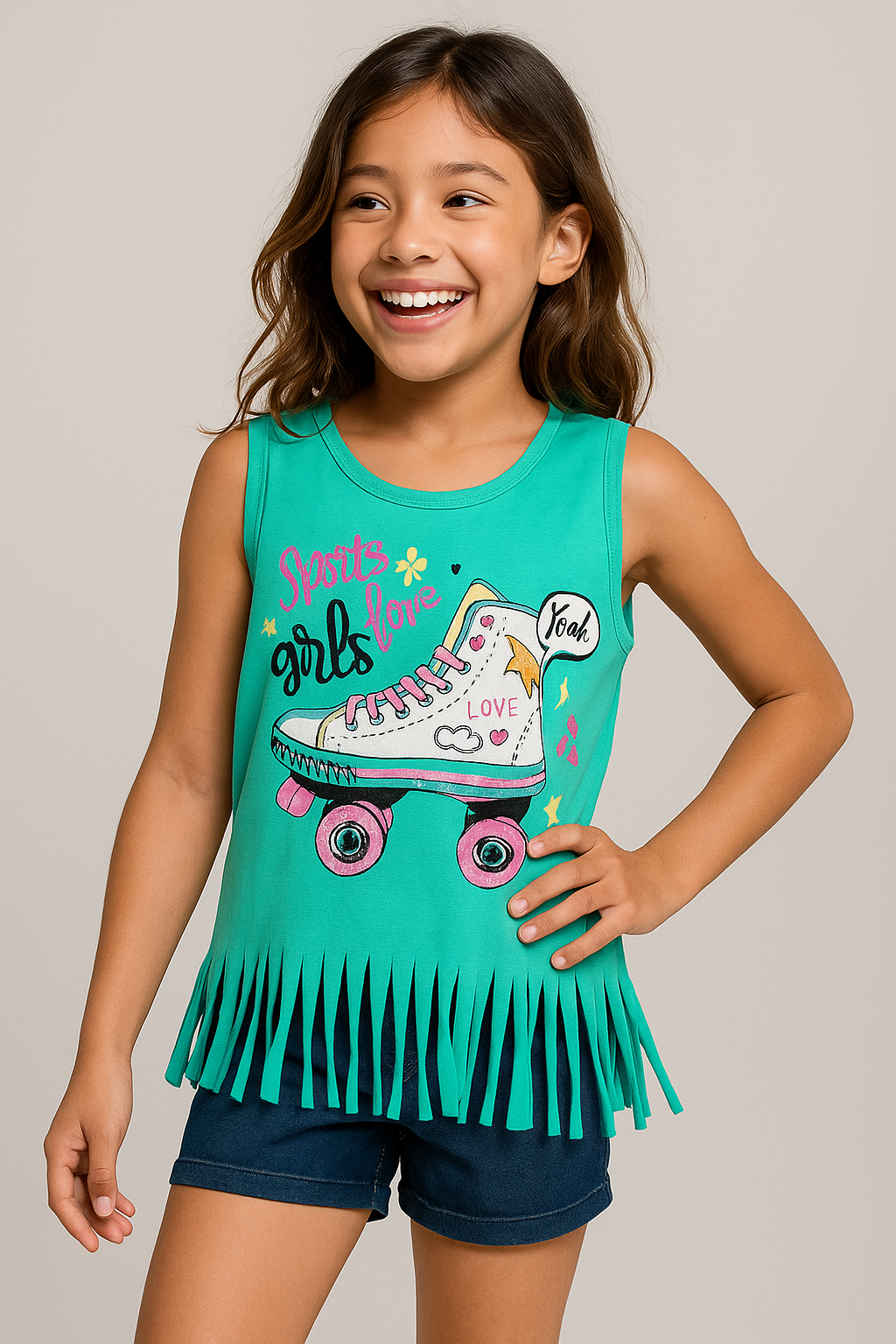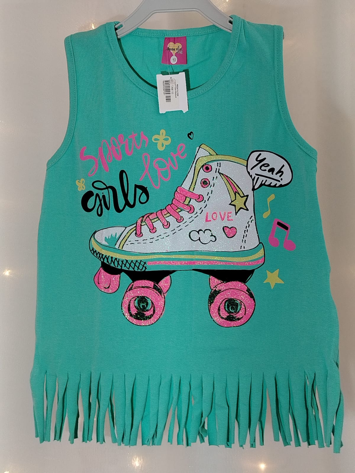 A peça na cor verde água possui barras em franjas, que dão um toque moderno e divertido, e uma linda estampa de patins com glitter e frases alegres como “Sports Girls Love” e “Yeah”.