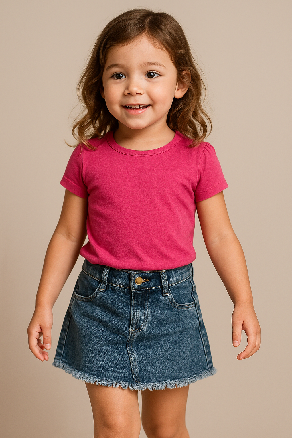 Short saia jeans infantil Trajadinhos, confeccionado em tecido confortável e maleável, ideal para o dia a dia. Possui lavagem moderna, barra desfiada, cós com passantes, bolsos frontais e traseiros, além de fechamento por botão.