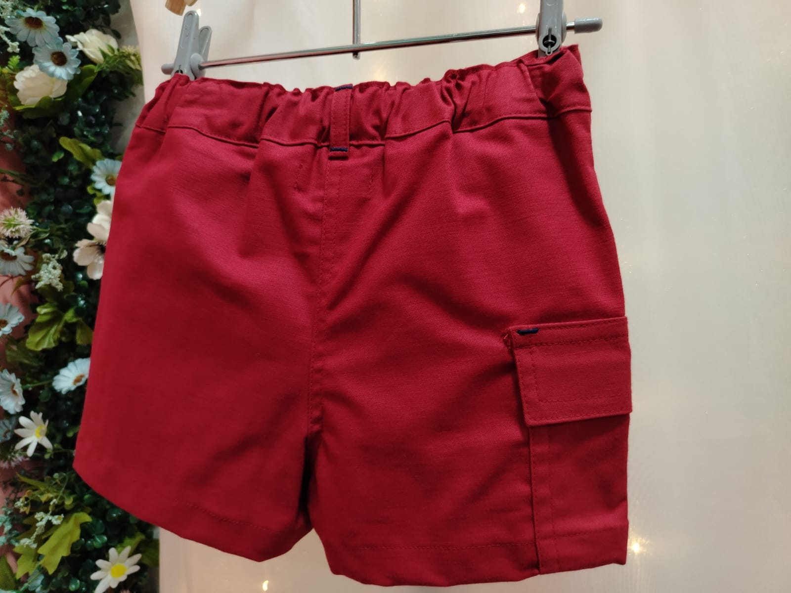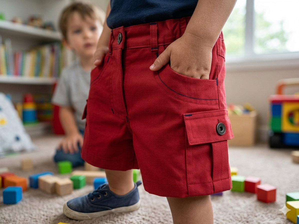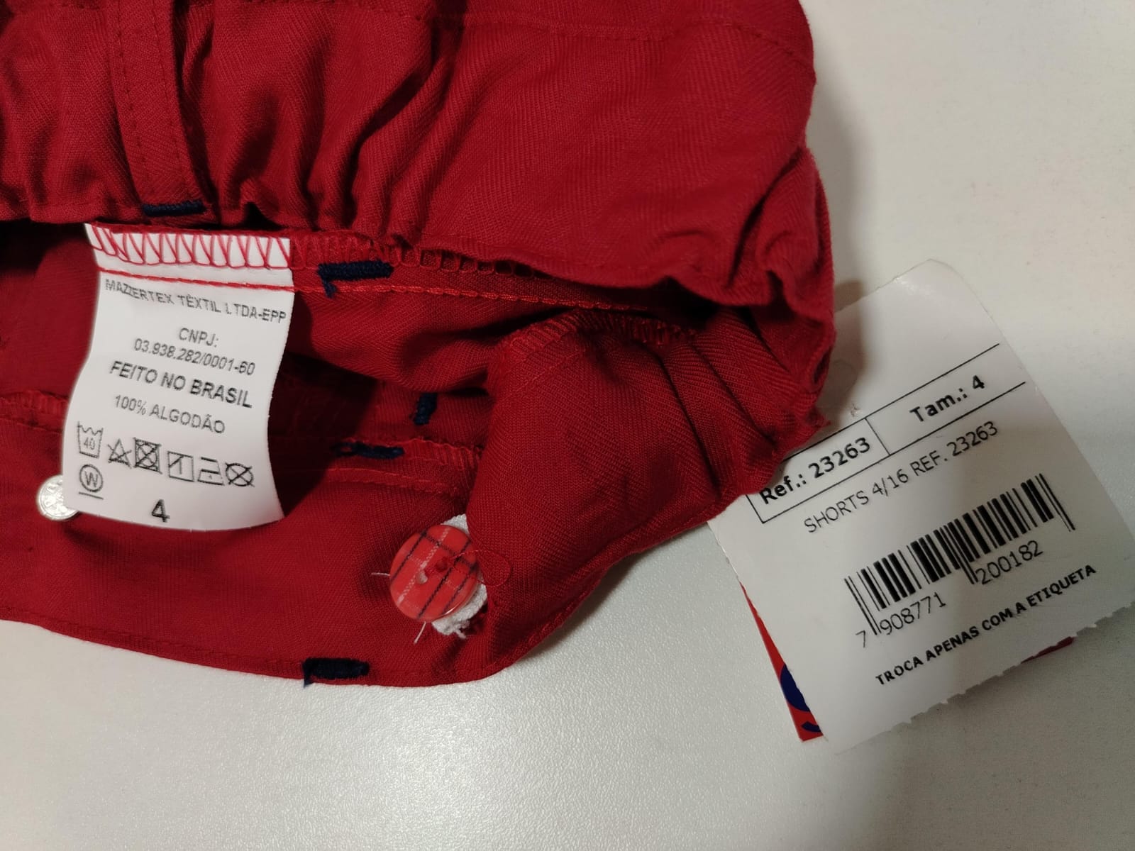Descrição principal completa do produto: Shorts infantil masculino vermelho, tamanho 4 anos, confeccionado em 100% algodão. Modelo com cós traseiro em elástico, passantes para cinto, fechamento frontal por botão, bolsos frontais funcionais e bolso lateral estilo cargo com aba e botão. Peça confortável, prática e estilosa para compor looks casuais infantis.