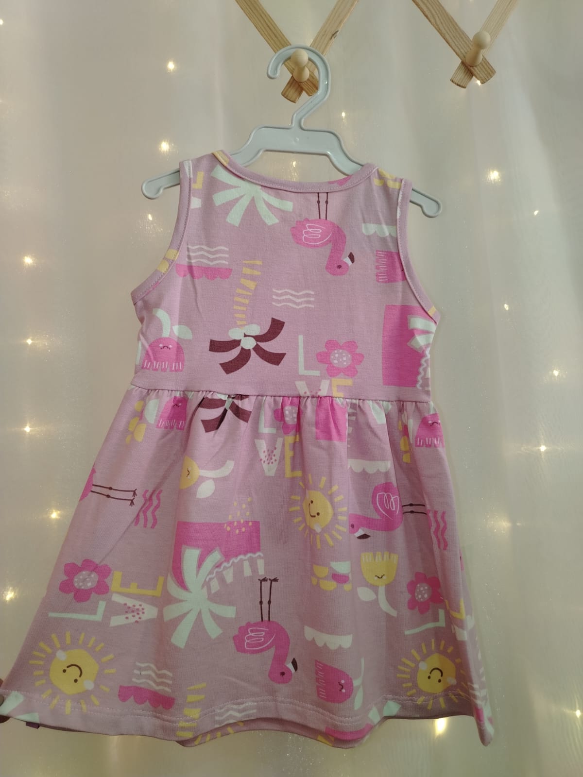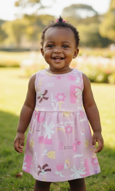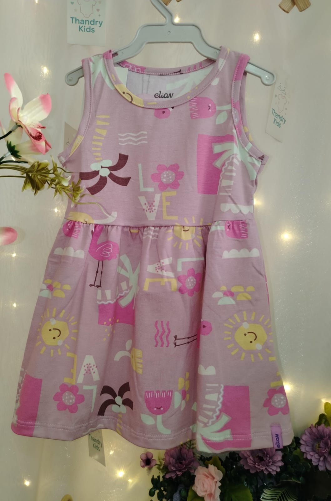 Vestido infantil feminino confeccionado em malha macia, com toque suave e confortável para a pele do bebê. Possui modelagem sem mangas, corte soltinho e saia levemente rodada, garantindo liberdade de movimento. Estampa delicada e divertida em tons suaves, trazendo um visual alegre e encantador. Ideal para o dia a dia, passeios e momentos especiais, unindo conforto, praticidade e charme.