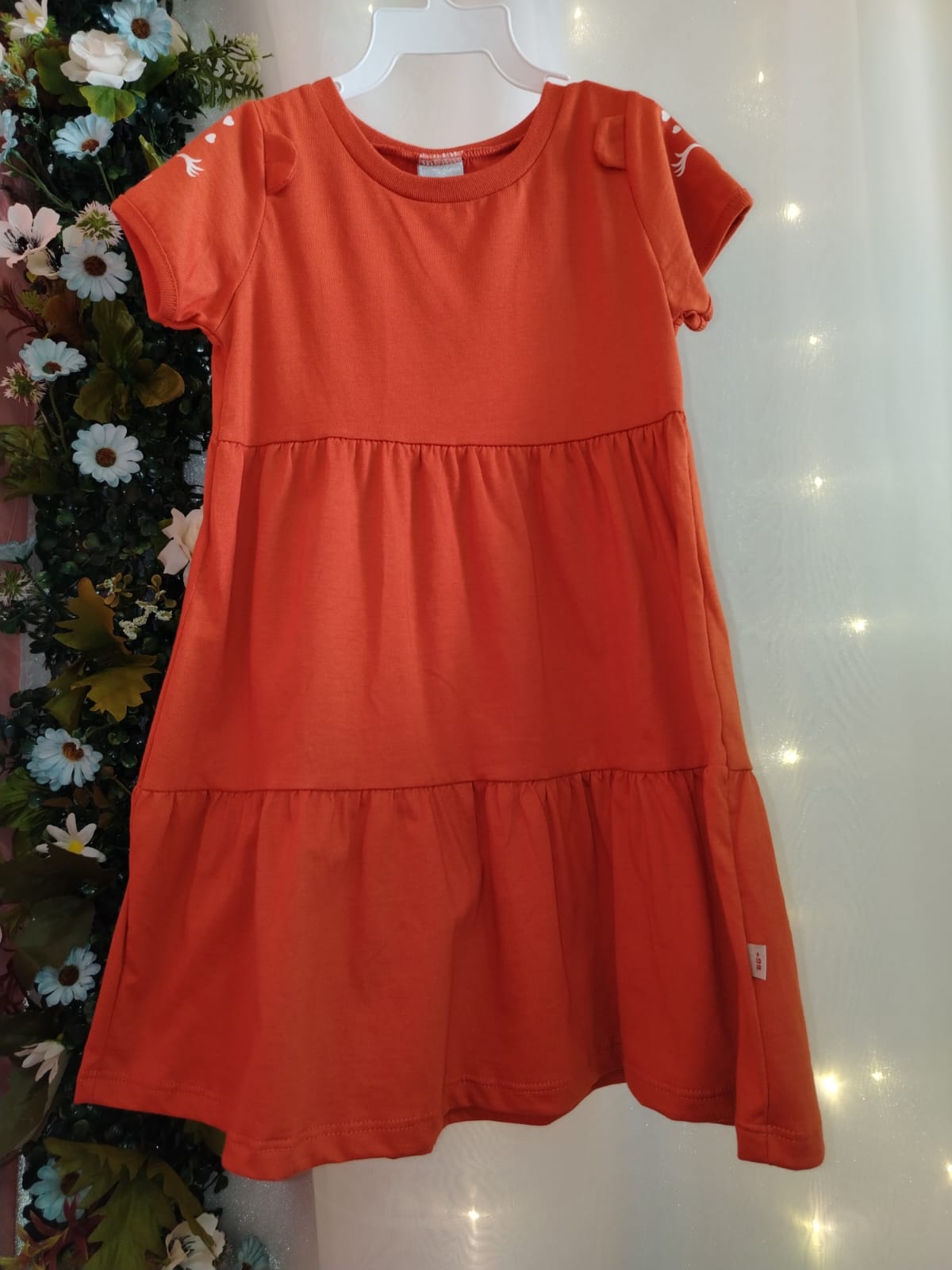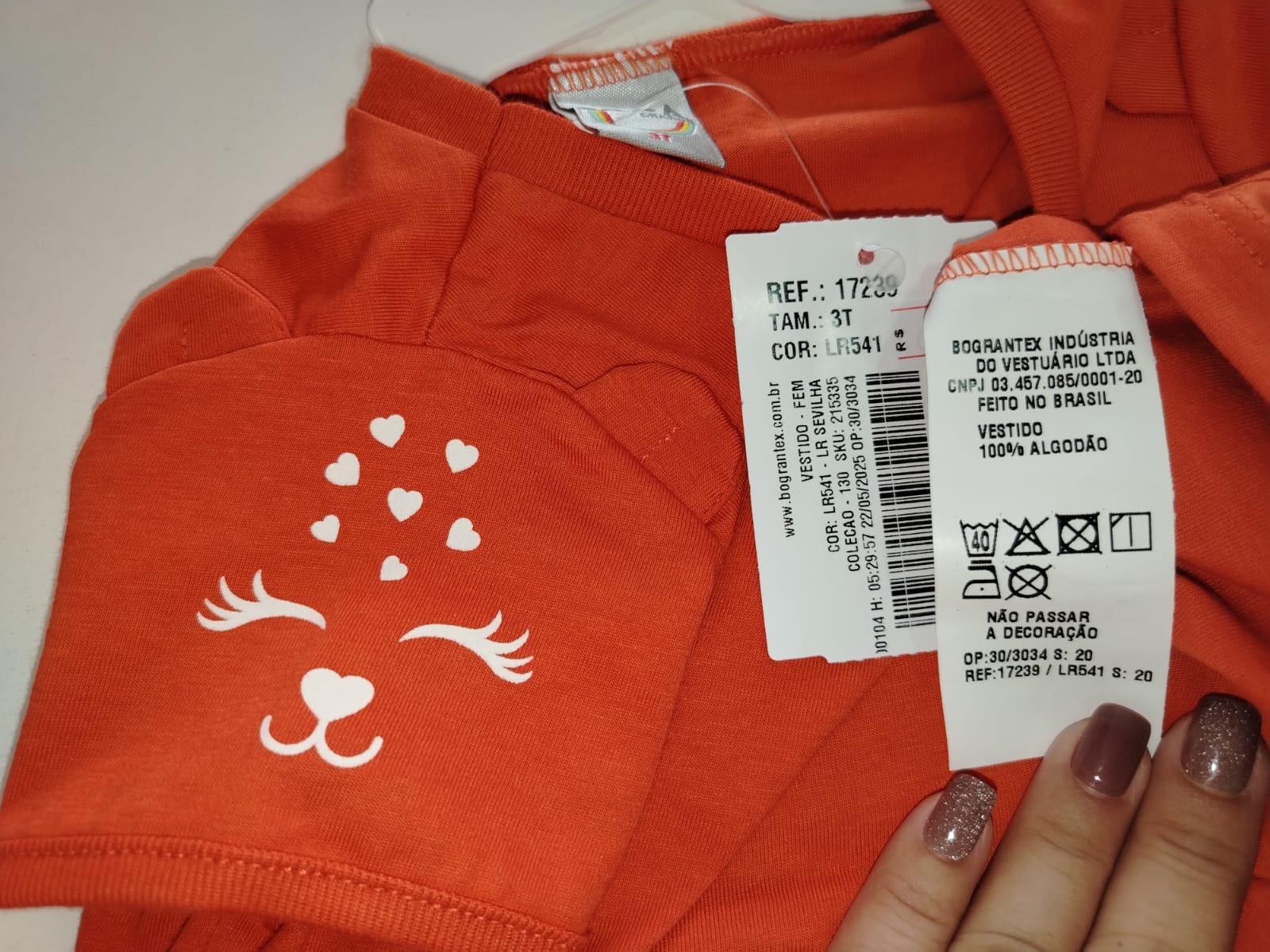 Vestido infantil feminino confeccionado em malha 100% algodão, proporcionando toque macio, conforto e excelente respirabilidade para o dia a dia. Possui modelagem soltinha com recorte em camadas, mangas curtas e acabamento delicado. Destaque especial para a estampa localizada nas mangas, com detalhe de rostinho e corações, que traz charme e delicadeza à peça. Ideal para uso diário, passeios e ocasiões casuais, garantindo liberdade de movimentos e bem-estar. Cor laranja vibrante, alegre e moderna. Produto novo, original e fabricado no Brasil.