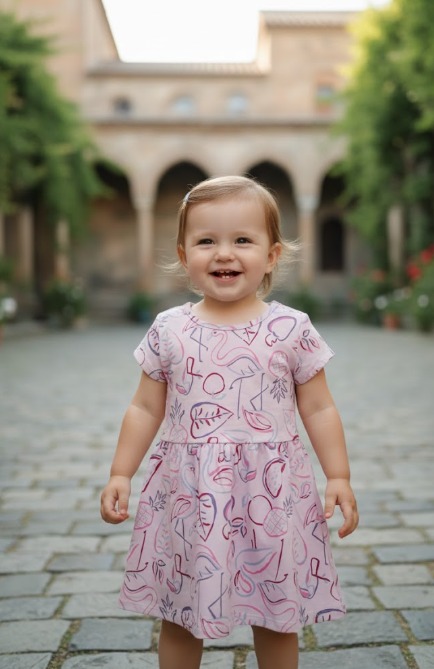Vestido infantil feminino da marca Elian, confeccionado em malha macia com estampa delicada e moderna, ideal para o dia a dia das pequenas. Possui mangas curtas, gola redonda e saia com leve franzido, garantindo conforto e liberdade de movimento. Modelo leve, fresco e confortável, perfeito para passeios, uso diário ou ocasiões especiais. Tecido de toque suave, proporcionando bem-estar durante todo o uso.