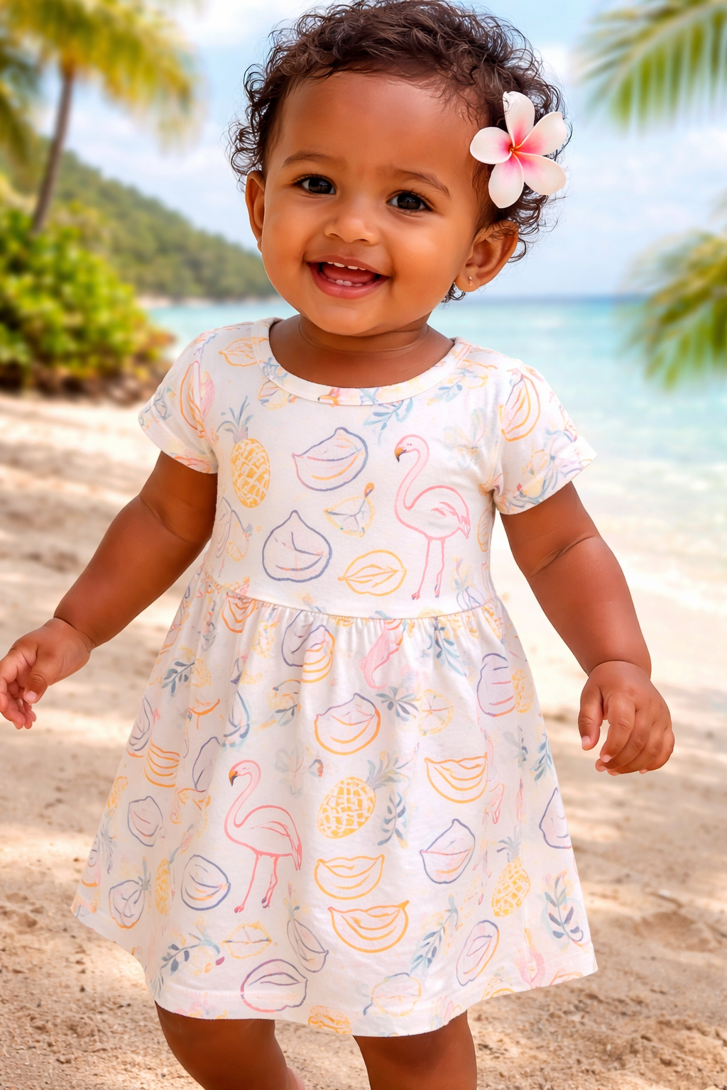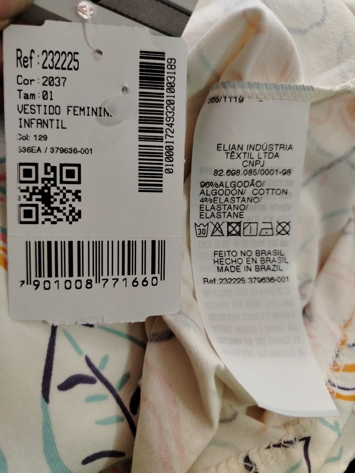 Vestido infantil feminino da marca Elian, tamanho 01, com estampa delicada e colorida. Modelo com mangas curtas, recorte na cintura e saia levemente rodada, proporcionando conforto e liberdade de movimento. Confeccionado em malha macia, ideal para o uso diário da criança.