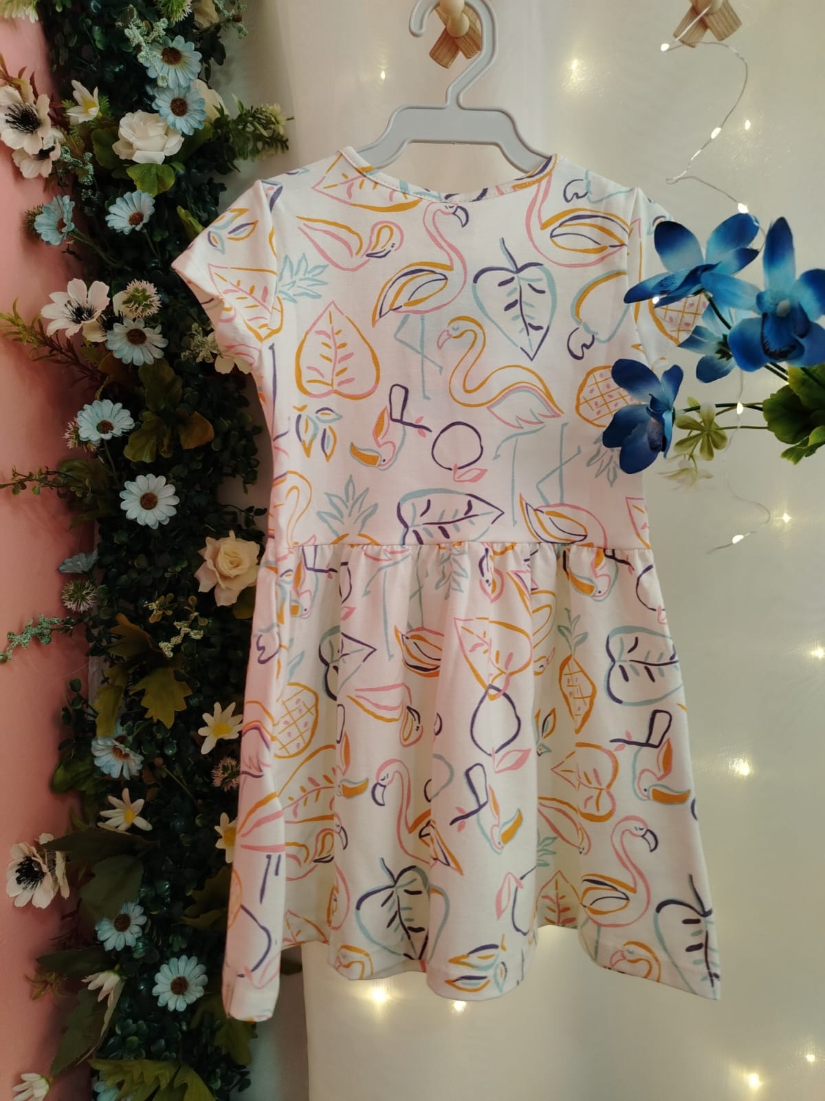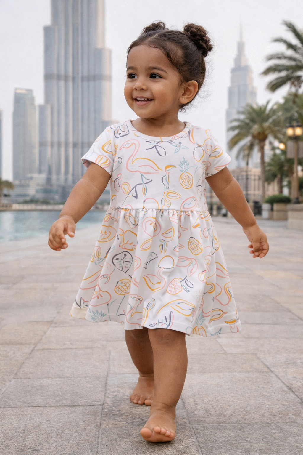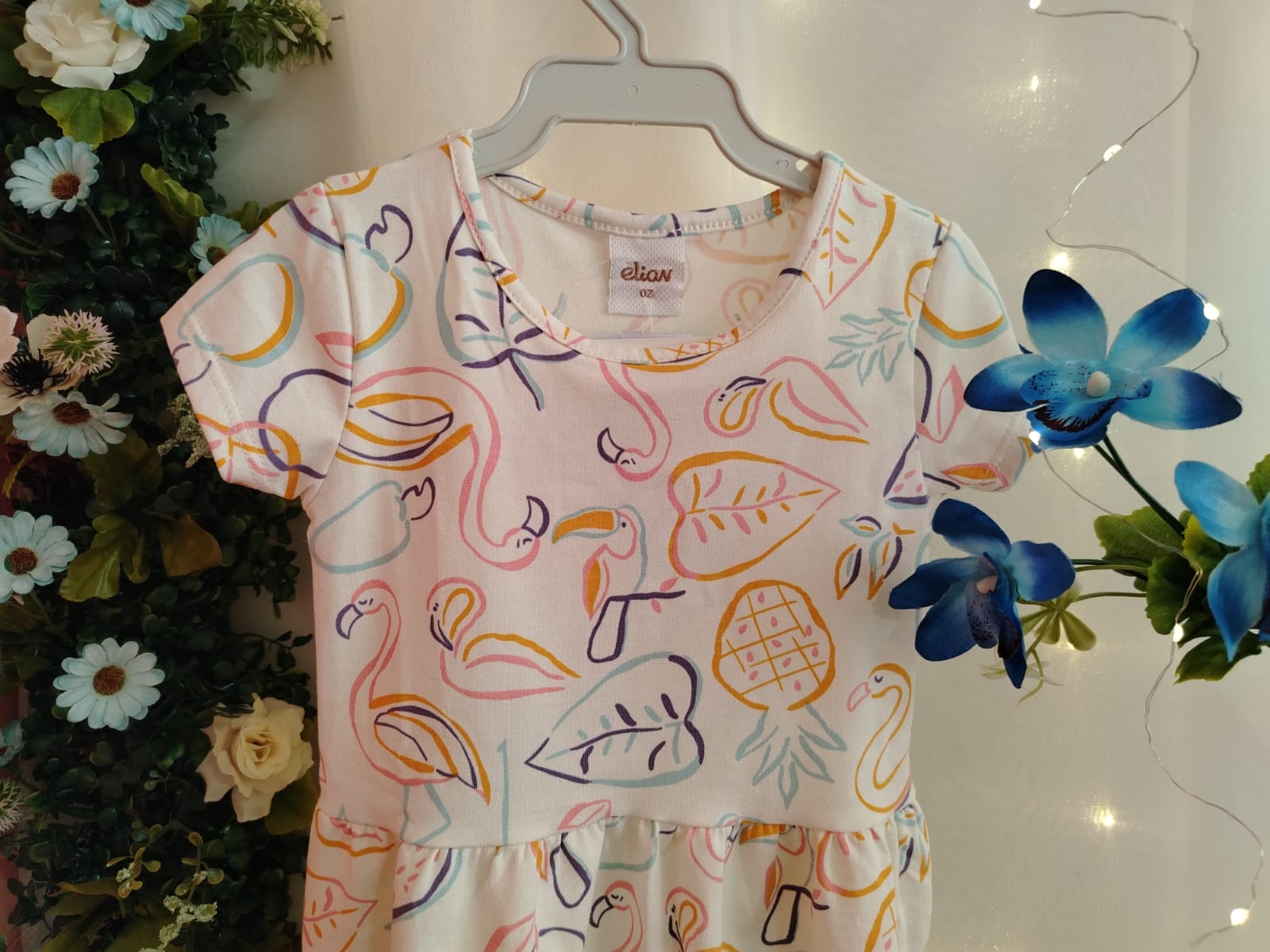 Vestido infantil feminino confeccionado em malha macia, com excelente conforto para o dia a dia. Possui mangas curtas, gola redonda e modelagem soltinha, proporcionando liberdade de movimentos. Estampa alegre e delicada com elementos tropicais, ideal para compor looks leves e fresquinhos para as pequenas.