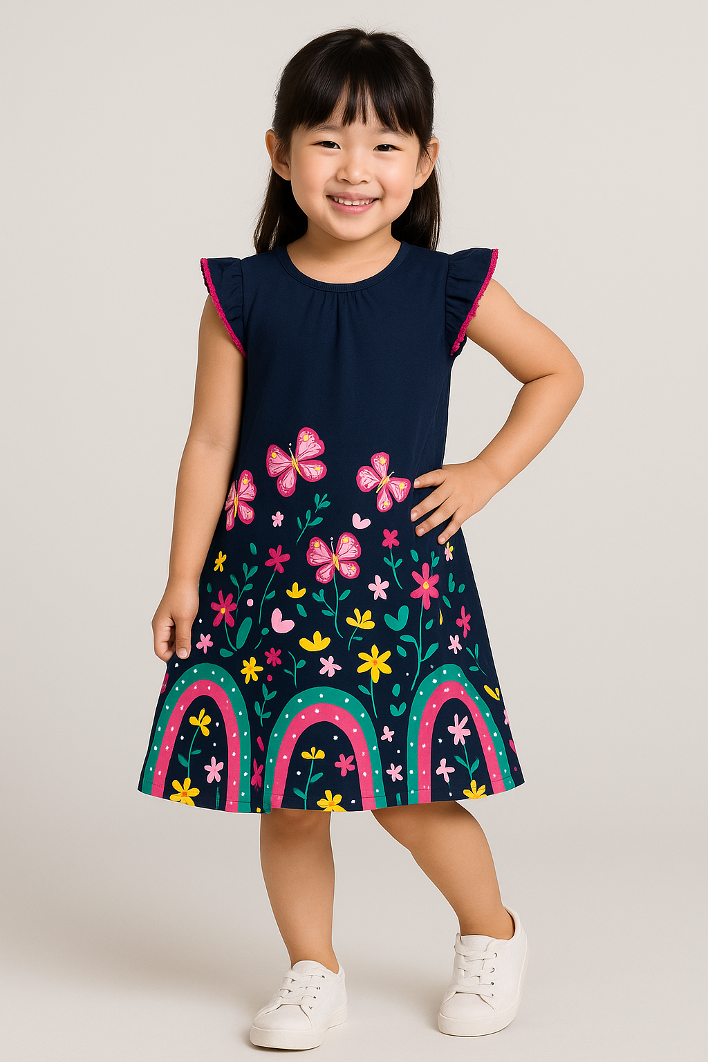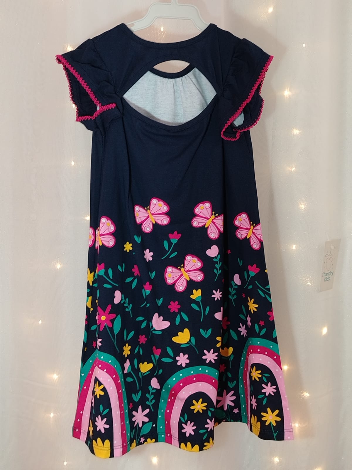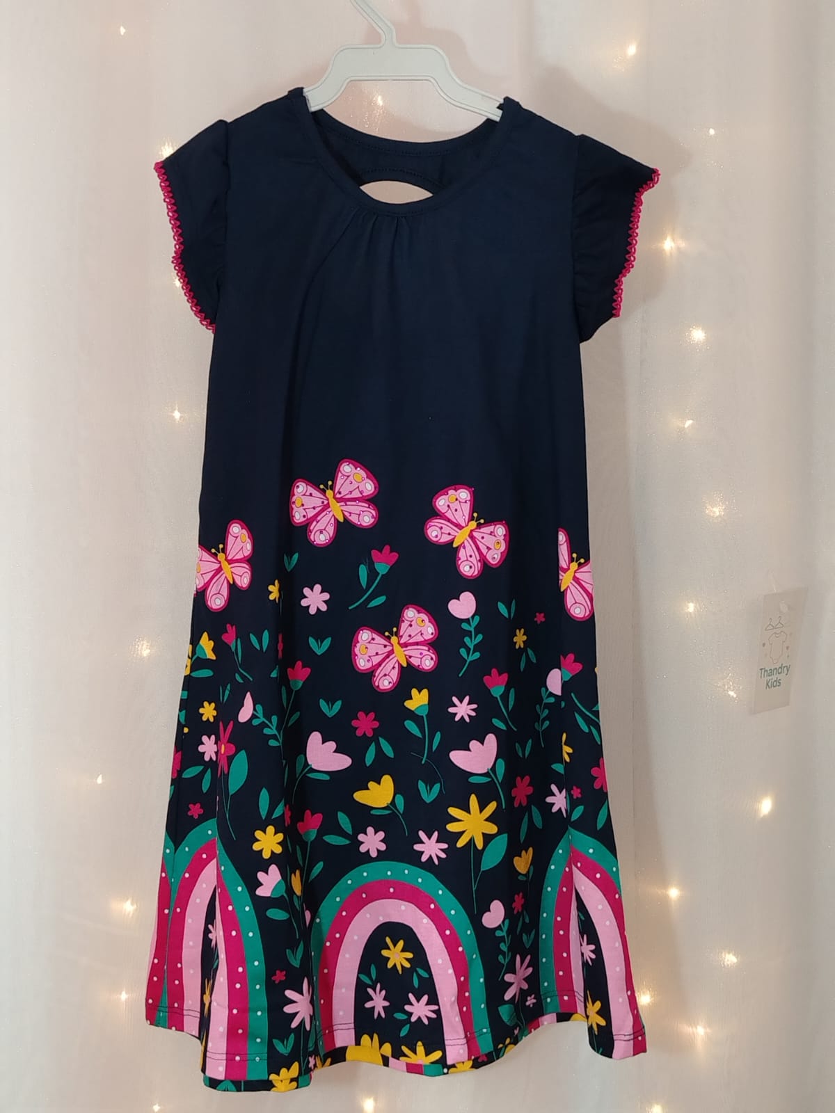 Modelo com mangas curtas e detalhe vazado nas costas, proporcionando charme e frescor. Estampa alegre com borboletas, flores e arco-íris, trazendo um visual lúdico e colorido que encanta.