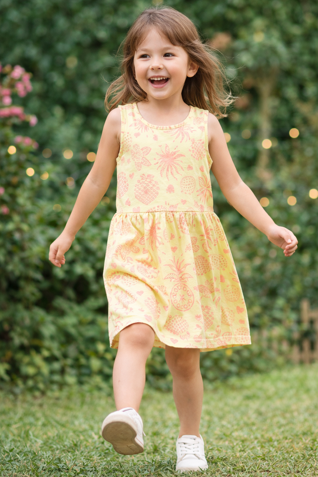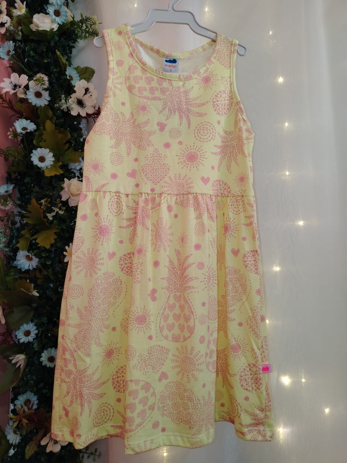 Vestido infantil feminino Marlan confeccionado em malha 100% algodão, tecido leve e confortável ideal para o dia a dia. Modelo sem mangas com decote redondo e recorte na cintura que proporciona ótimo caimento e liberdade de movimento. Estampa alegre em fundo amarelo com desenhos de abacaxis, corações e elementos tropicais em tons de rosa, deixando o visual delicado e divertido. Peça fresca, macia ao toque e perfeita para dias quentes, passeios ou rotina escolar.