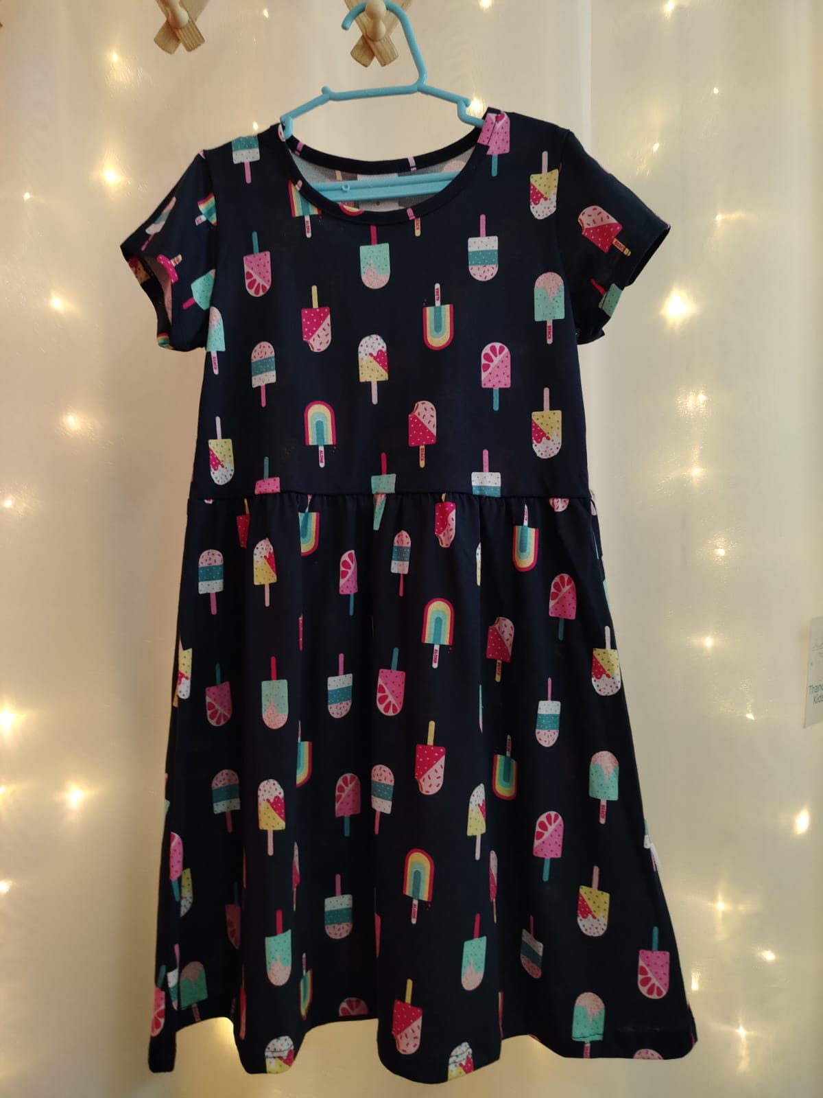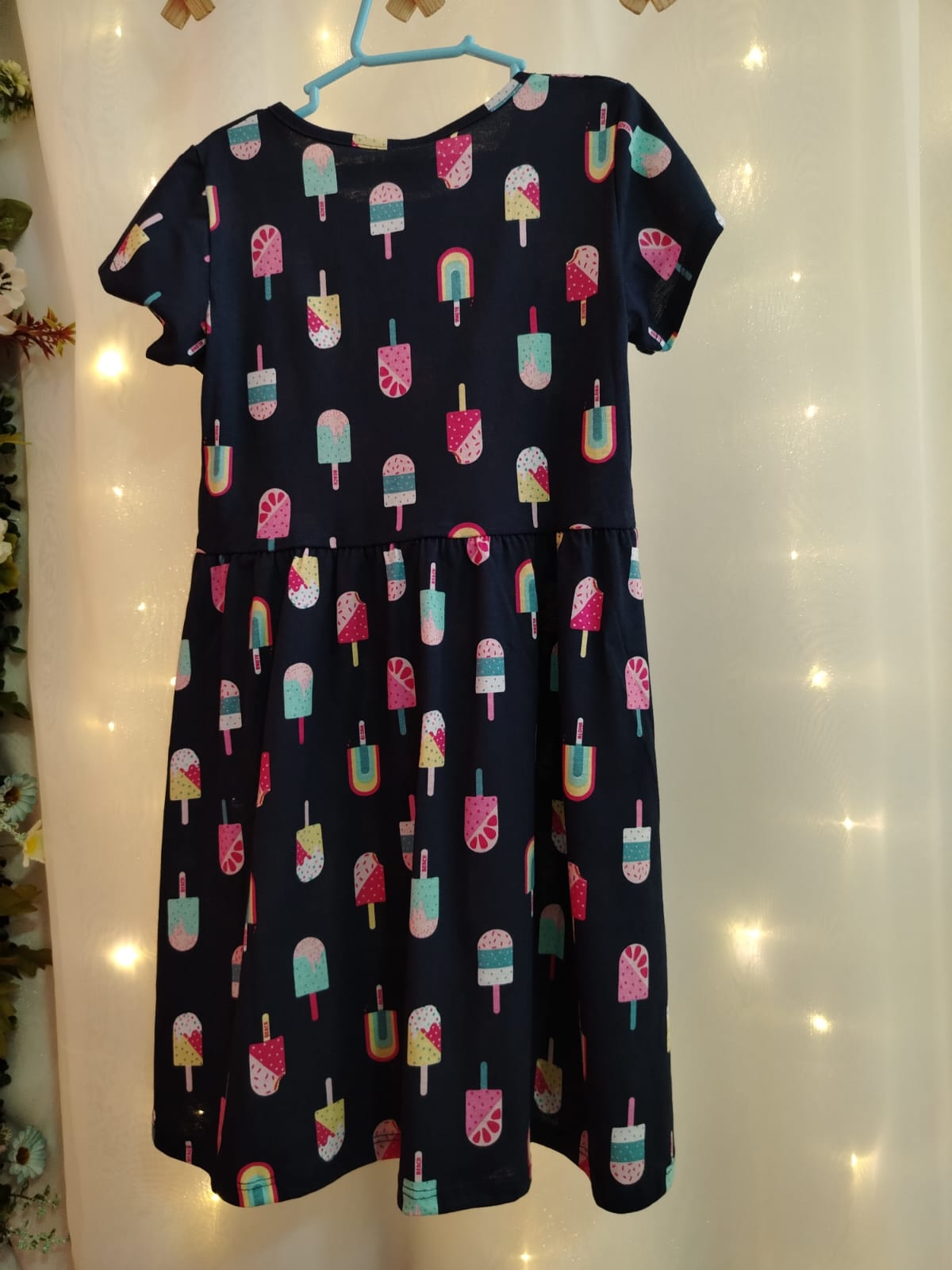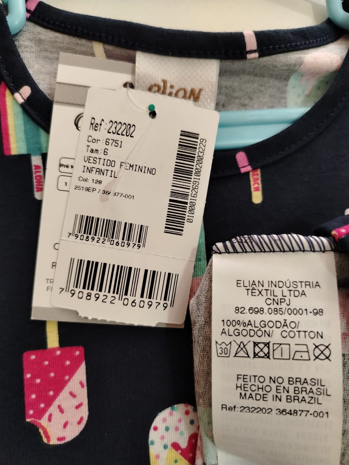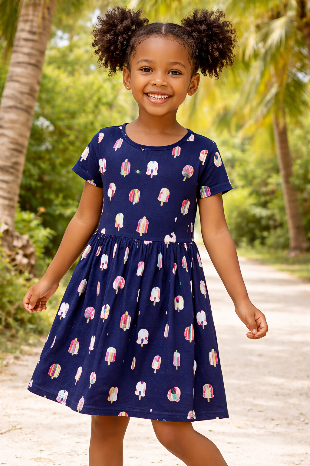 Vestido infantil feminino Elian confeccionado em malha 100% algodão, tecido macio e confortável ideal para o dia a dia. Modelo de manga curta com decote redondo e recorte na cintura proporcionando ótimo caimento e liberdade de movimento. Estampa divertida com picolés coloridos e arco-íris em fundo azul marinho, trazendo um visual alegre e moderno para as pequenas. Peça leve, fresca e perfeita para passeios, escola ou momentos especiais.
