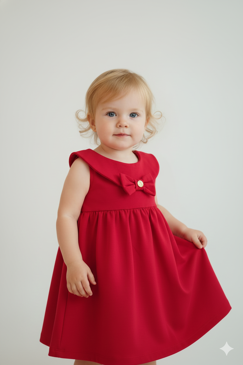 Vestido infantil feminino confeccionado em tecido macio e confortável, com excelente elasticidade. Possui modelagem clássica, sem mangas, gola arredondada e saia levemente rodada, garantindo charme e liberdade de movimentos. Detalhe frontal em laço com botão decorativo dourado, que traz um toque delicado e elegante à peça. Ideal para ocasiões especiais ou para um look arrumadinho no dia a dia.