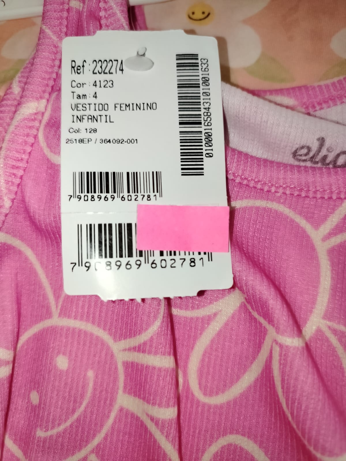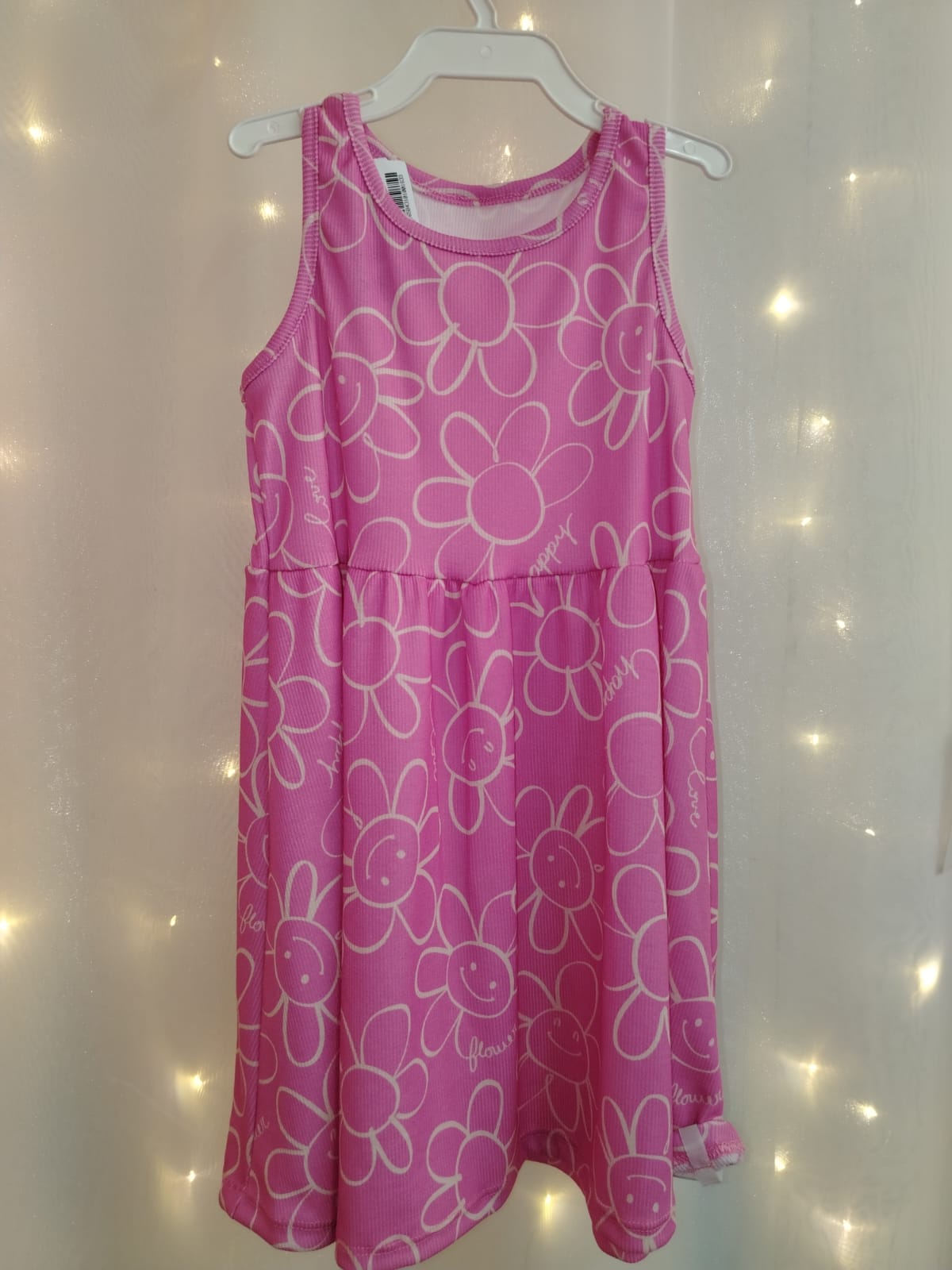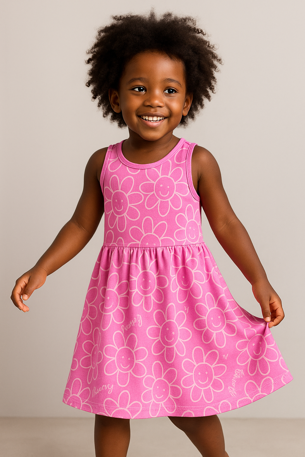 Com tecido em malha suave, estampa de flores sorridentes e um tom de rosa vibrante, esta peça traz leveza e alegria para o dia das pequenas.